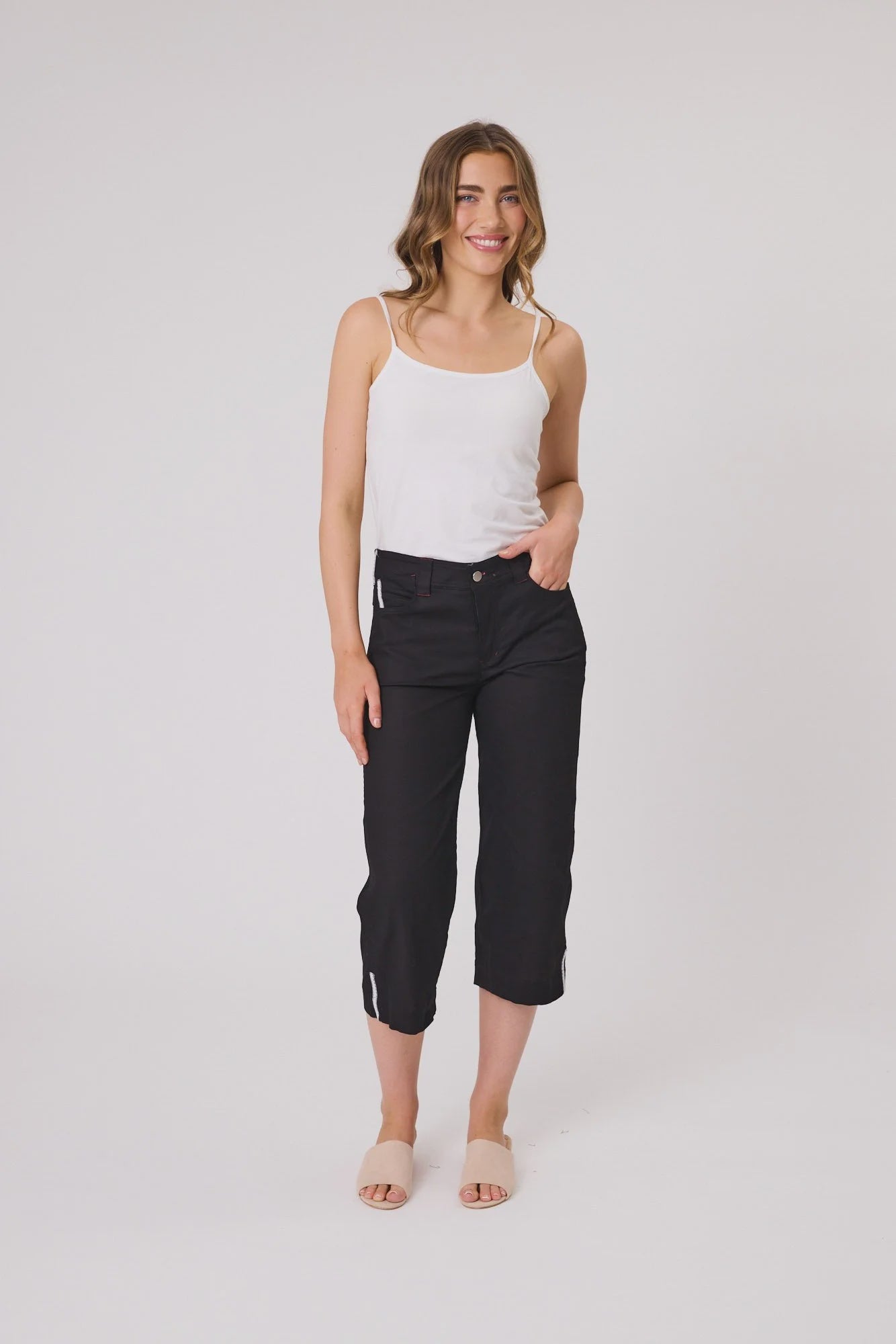 The Lily 3⁄4 Pant offers a perfect blend of comfort and style. Made from a soft cotton- elastane textured fabric, these pants provide a breathable, stretchy fit that moves with you throughout the day. The elasticated waist ensures a flexible, comfortable fit, while the braid trim on the belt loops and bottom of the side leg adds a chic, stylish detail to the classic 3⁄4 pant design.